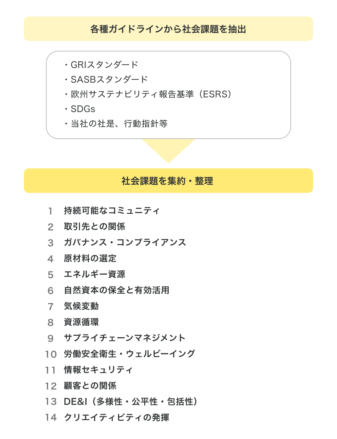 以下のガイドライン等から、当社に影響の大きい項目を抽出し、14点の社会課題に集約・整理しました。