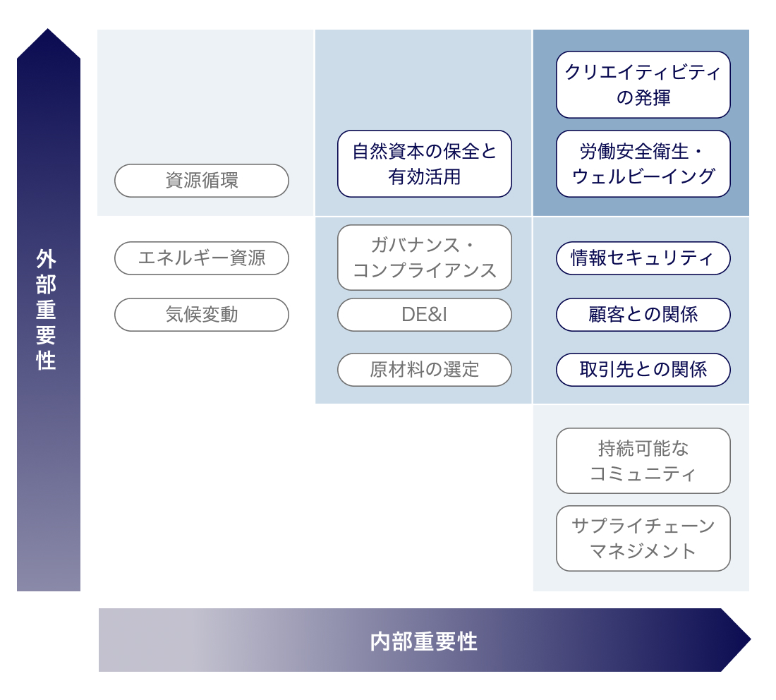 整理した社会課題を自社を取り巻く内部・外部の重要性でマッピングし、重要な社会課題(マテリアリティ)を特定しました。