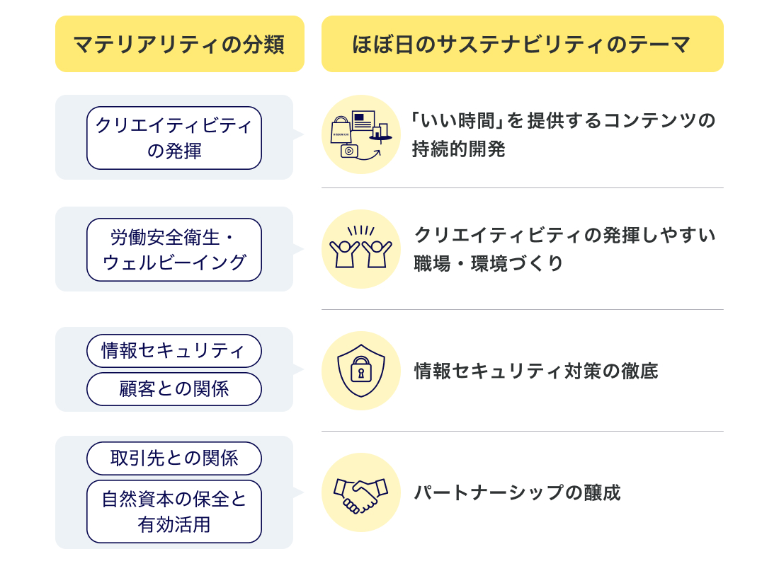 こうした中で、外部環境の要請に受動的な対応で表面的・画一的な取組みに終始し、本来の当社が目指す姿を置き去りにしないよう、改めてマテリアリティ(重要課題)を分析しました。そして、当社のコンテンツにおけるサステナビリティに対して効果的に取り組み、ひいては当社だけでなく社会に開かれた持続可能性確立のためのアクションとして4つのテーマを設定しました。