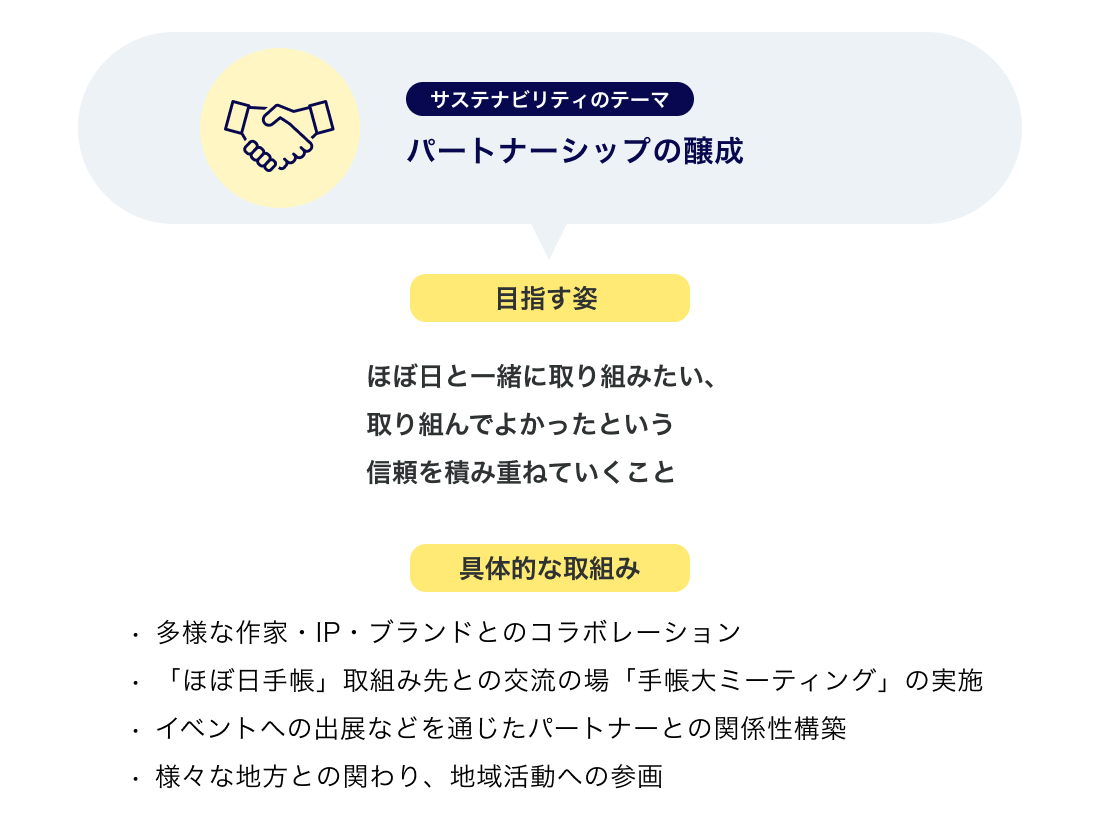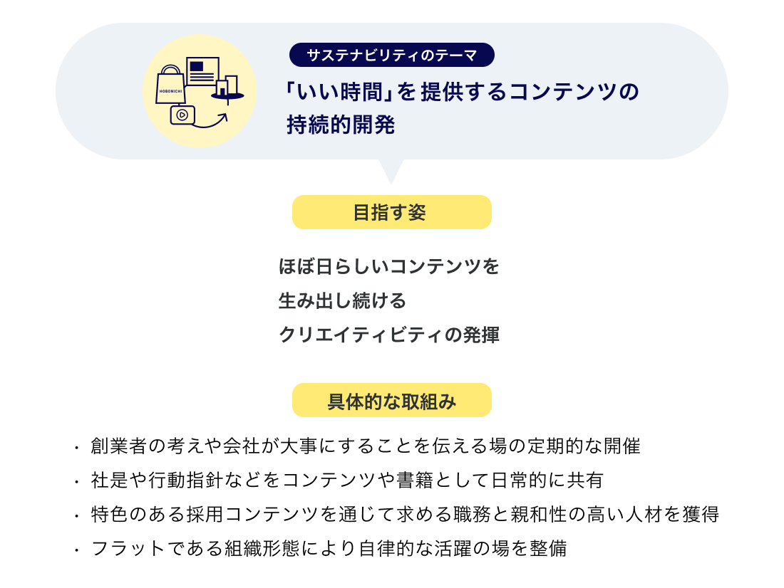 当社は、新しい価値を生み出し、人びとが集う「場」をつくり、「いい時間」を提供するコンテンツを企画、編集、制作、販売する会社であるために、事業の土台となる情報セキュリティの強化やほぼ日に関わるすべての人々の多様性を尊重し、誠実な事業活動を行うことを大切にしています。