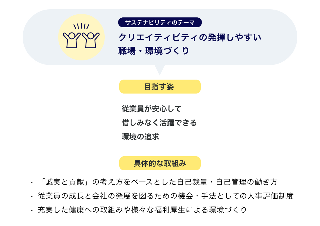 各テーマにおいて、当社のコンテンツの根幹を担うクリエイティビティをいかに発揮できるかに軸足を置き、表面的な指標管理にとらわれない自律的な取組みを通じてサステナビリティを実現し、ステークホルダーとの共創社会を築いていきます。